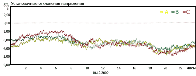 Замеры фазных напряжений производились в одних и тех же трансформаторных подстанциях КТП в условиях ярко выраженных несимметричных нагрузок (застройки поселково-коттеджного типа).